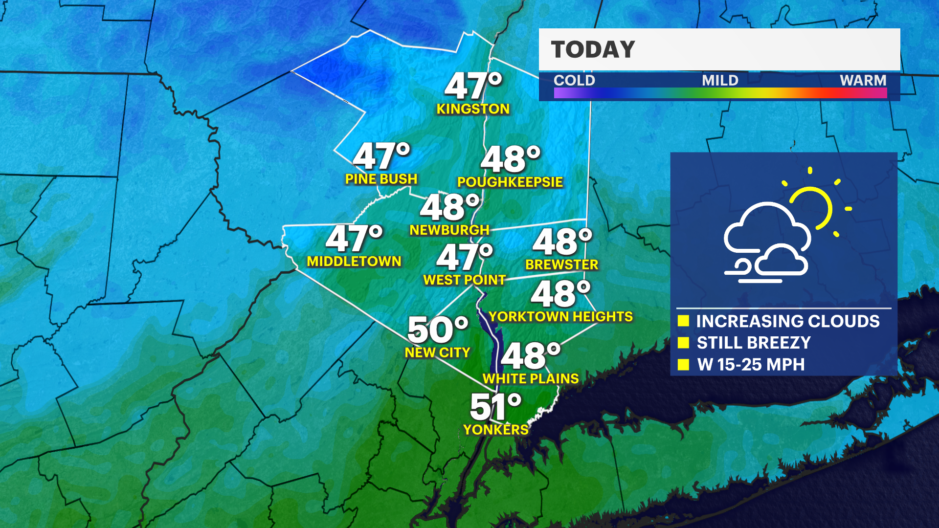 An east breeze will bring cool temperatures and cloudy skies on Thursday with highs in the 40s. Temperatures may recover on Friday and Saturday depending on how quickly the east breeze off the Atlantic lets up.